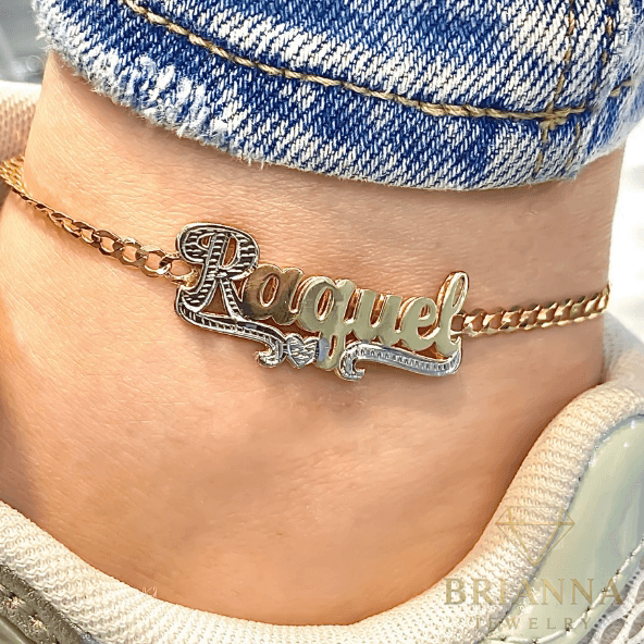 Elevate your style with this exquisite 14K Custom Double Plate Name Ankle Bracelet. Crafted from genuine 14K yellow gold, this remarkable piece is designed to endure, resembling a cherished collection jewel. It features a dazzling double plate nameplate, meticulously diamond-cut and finished with rhodium accents, presented with dimensions of 10 inches and 3.5MM. Each bracelet is handcrafted with precision in New York. Purchase with confidence: this piece includes a 1-year warranty provided by @Brianna Jewelry, from New York’s premier jeweler.