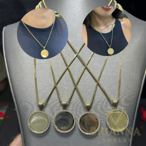 14k Cuban Chain Picture Frame Pendant – crafted from authentic 14k yellow gold, featuring a hollow Franco chain (20 inches, 1.5MM width) and a picture pendant (1″ diameter, 1.2″ with bell). Includes cubic zirconia accents and a 1-year warranty.