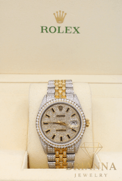 Presenting a distinguished pre-owned Rolex Watch, custom-enhanced with a brilliant diamond bezel, identified as . This exquisite luxury timepiece is meticulously crafted from genuine 14k yellow and white gold, embodying exceptional quality. Purchase with assurance from Brianna Jewelry DBA, recognized as New York’s premier jeweler.
